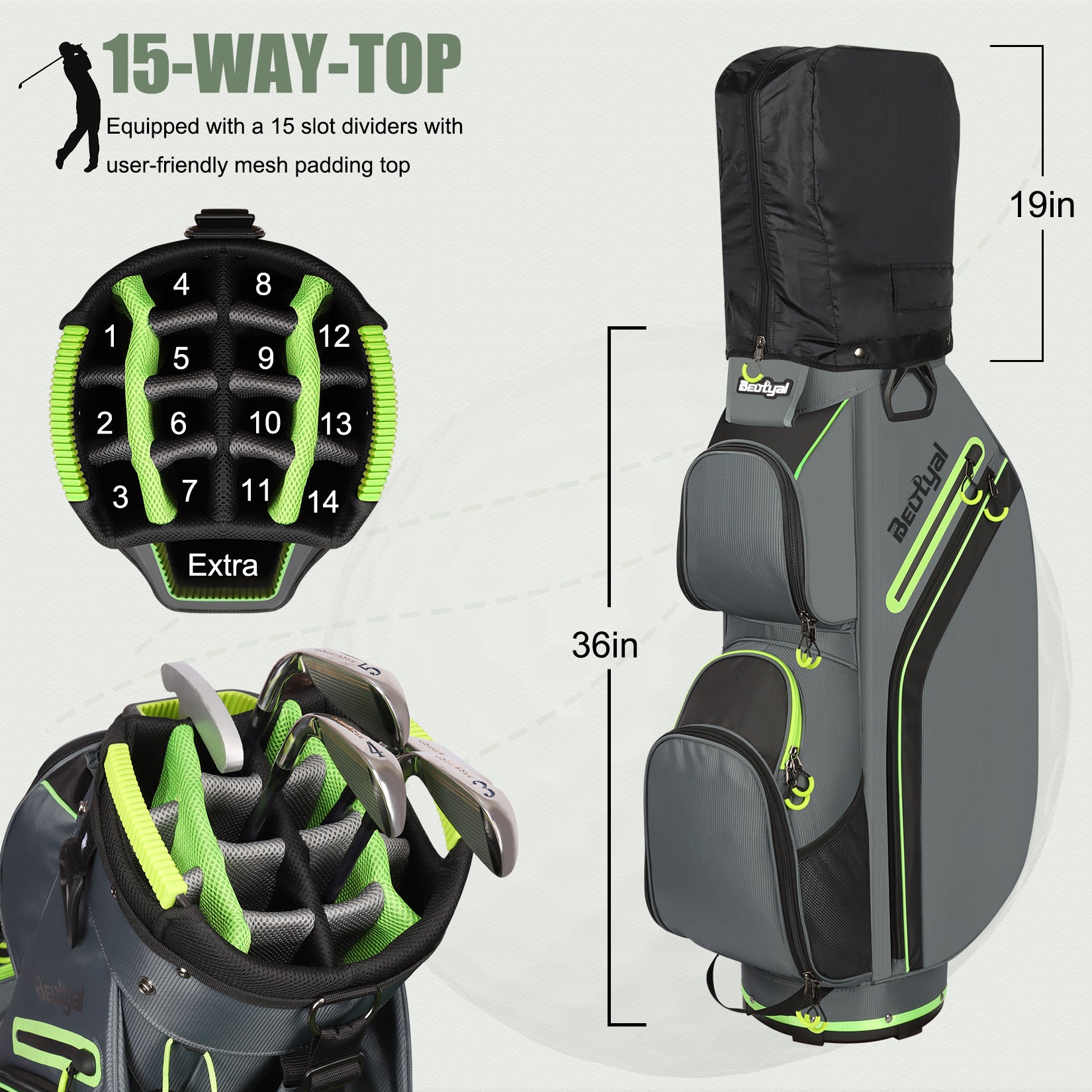 Elevate your game with the Beutyal Cart Golf Bag, designed to keep your clubs impeccably organized. The innovative 15-way top divider ensures each club has its own dedicated space, allowing for effortless access and preventing any accidental impact damage. -